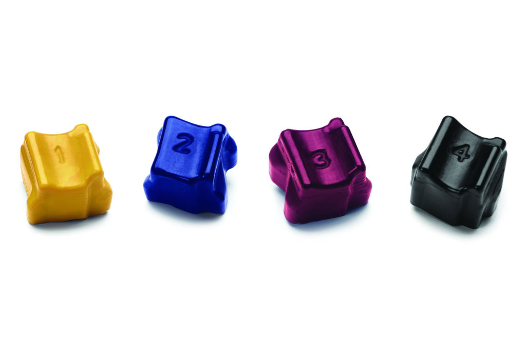 - Meno materiali di consumo. Niente ingombranti cartucce di stampa o fusori, lubrificante per fusori o unità imaging che si trovano in una normale stampante laser a colori. Oltre agli stick di inchiostro solido, l’unico altro componente sostituibile è un rullo di manutenzione/unità di pulizia che dura per decine di migliaia di pagine e va sostituito solo poche volte durante l’intero ciclo di vita del vostro dispositivo.